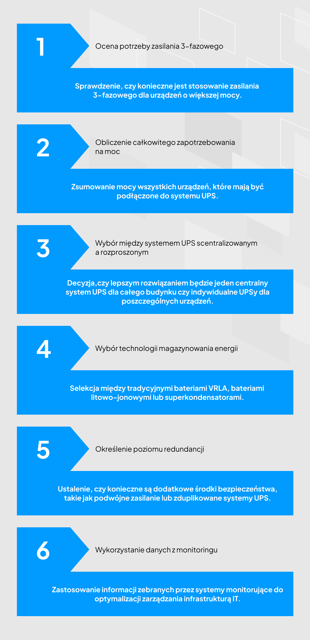 Proces wyboru odpowiedniego systemu UPS jest kluczowy, aby spełnić specyficzne potrzeby energetyczne i operacyjne przedsiębiorstwa. W niniejszym artykule omówimy sześć fundamentalnych kroków, które pomogą w optymalnym doborze systemu UPS, zapewniając maksymalną ochronę i efektywność energetyczną.