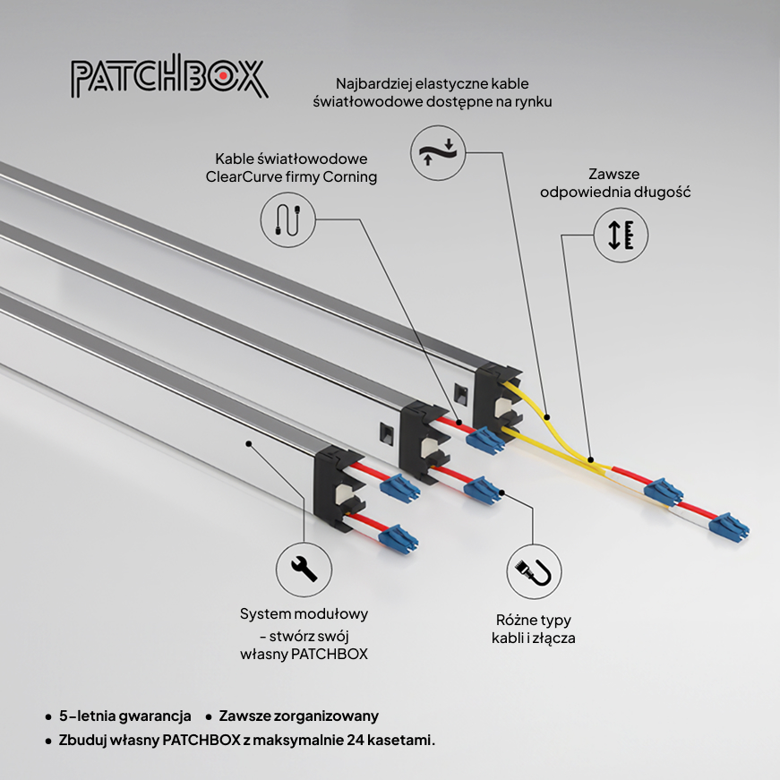 patchbox.one z kablami światłowodowymi to idealne rozwiązanie dla czystej, wydajnej i gotowej na przyszłość szafy sieciowej. Wyposażona w ultraelastyczne, zwijane kable wykonane z Corning® ClearCurve® Fiber, zapewnia wysoką wydajność przy zachowaniu doskonałej organizacji – bez nadmiaru długości, bez bałaganu.