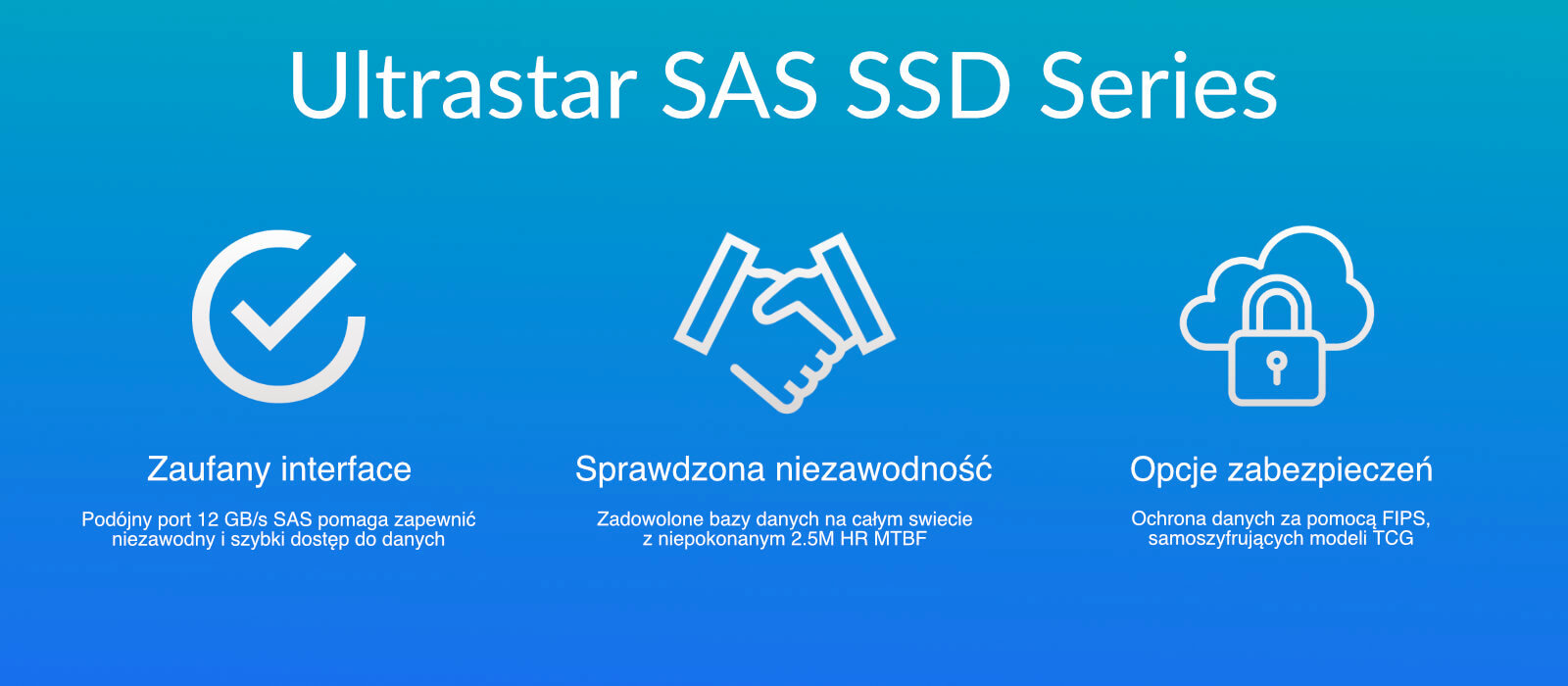 Dyski SSD Ultrastar SAS wykorzystują dziesięciolecia sprawdzonej wiedzy w zakresie pamięci masowej dla przedsiębiorstw w zakresie projektowania szeregowego interfejsu SCSI (SAS), niezawodności, oprogramowania wewnętrznego, kwalifikacji klientów i integracji systemów. Synergiczny związek między nowymi dyskami SSD o zwiększonej przepustowości i tradycyjnymi dyskami HDD zapewnia ekonomiczne, kompleksowe opcje pamięci masowej klasy korporacyjnej, które zapewniają niezawodność, kompatybilność, pojemność, oszczędność kosztów i wydajność systemu. Ta kombinacja sprawia, że dyski Ultrastar są idealnym wyborem, aby sprostać rosnącym wymaganiom dotyczącym niezawodności, wytrzymałości i wydajności w najbardziej wymagających środowiskach centrów danych.