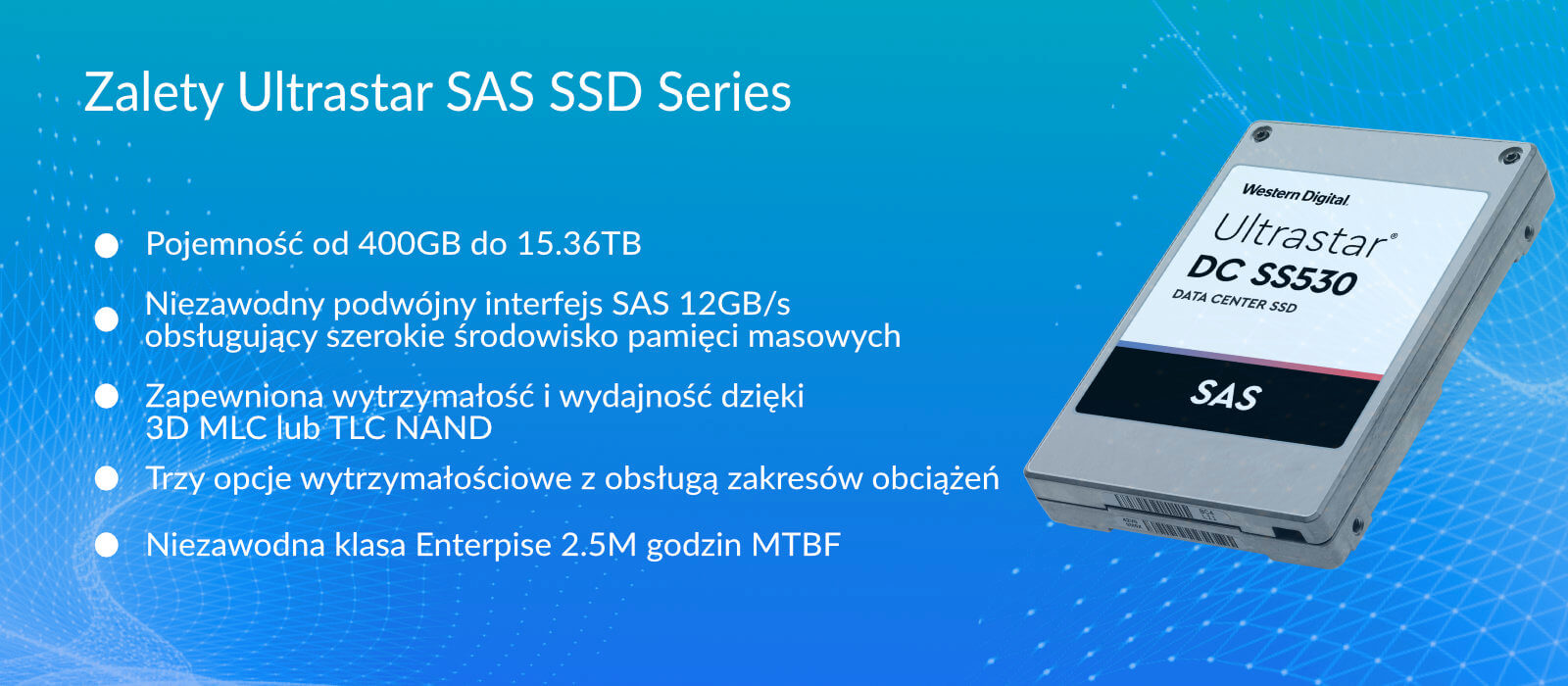 Dane przekształcają świat i rosną w tempie wykładniczym. Interfejs SAS nadal dominuje w tradycyjnych macierzach pamięci masowej dla przedsiębiorstw, dzięki czemu stale rosnąca ilość danych jest szybko i niezawodnie dostępna. Rozwiązania pamięci masowej zależą od funkcji ochrony SAS, takich jak przełączanie awaryjne na dwa porty w celu zapewnienia nadmiarowości, oraz wysokiej niezawodności SAS do zasilania aplikacji o znaczeniu krytycznym, takich jak ERP, OLTP, OLAP i inne. Zaprojektowany z dwuportowym interfejsem SAS 12 Gb/s do bezproblemowej integracji ze środowiskami korporacyjnymi, dysk SSD Ultrastar DC SS SAS jest dostępny w pojemnościach od 400 GB do 15,36 TB, czyli dwukrotnie większej niż w poprzednich generacjach. Zapewnia wydajność do 440 000 losowego odczytu i 320 000 losowego zapisu IOPS - najlepszy w swojej klasie wśród obecnych 12 Gb/s.