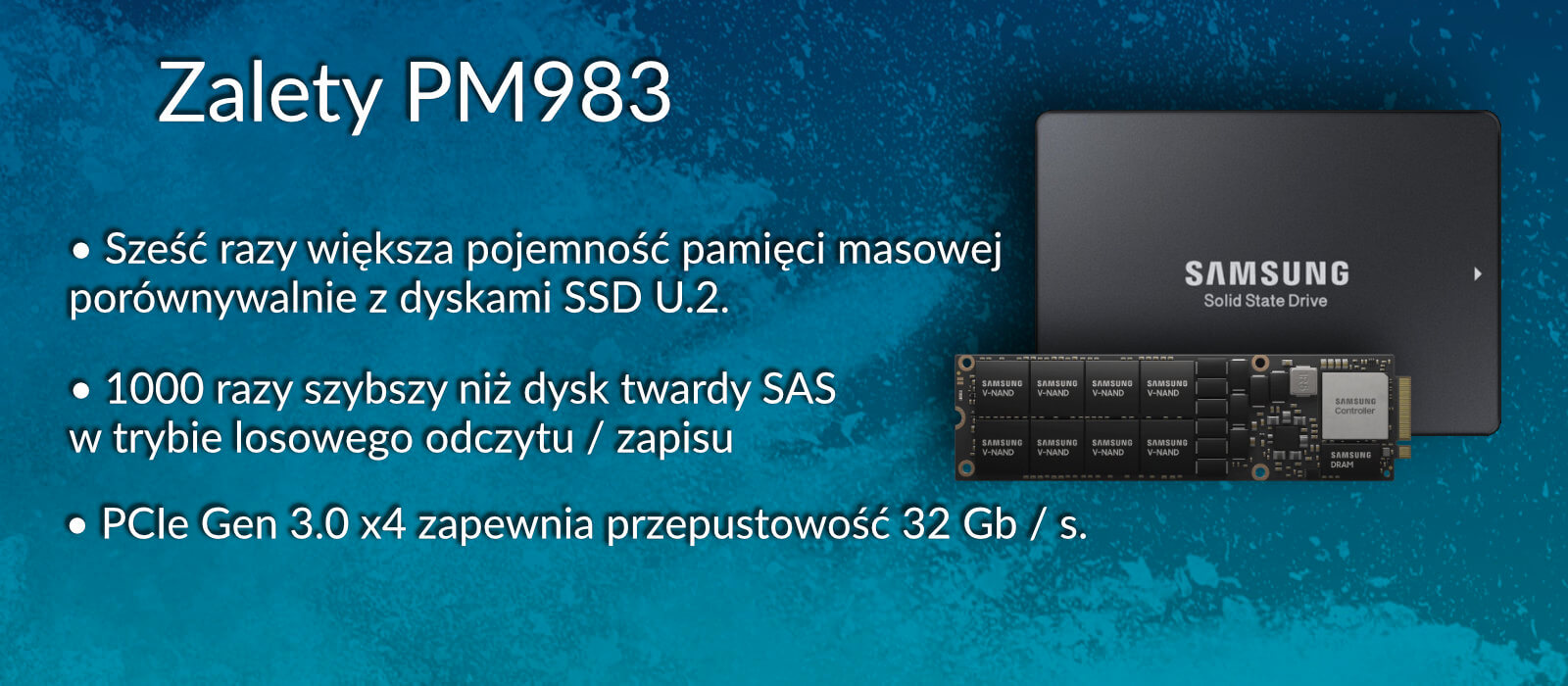 Dyski SSD Samsung PM983 możliwe do kupienia w wersji do 16 TB, które można zastąpić zamiast dysków 4 TB M.2 na serwerze 1U , co może czterokrotnie zwiększyć pojemność pamięci systemu. W rzeczywistości Samsung zademonstrował system serwerów referencyjnych, który dostarcza 576 TB w szafie 1U, wykorzystując 36 jednostek 16 TB SSD. System odniesienia 1U może przetwarzać około 10 milionów losowych odczytów IOPS, co trzykrotnie zwiększa wydajność IOPS serwera 1U wyposażonego w 2,5-calowe dyski SSD.