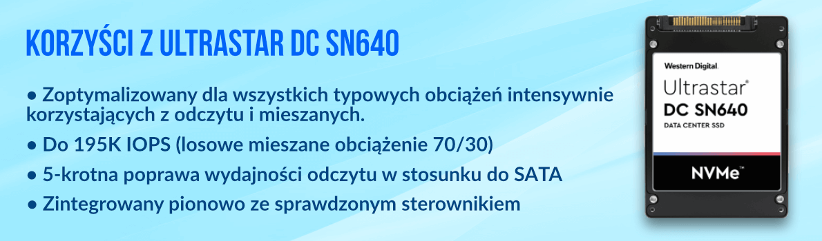 Teraz jest właściwy czas na przejście z dysków SATA SSD na wydajność NVMe w centrach danych chmur w hiperskali i na żądanie. Dysk SSD Ultrastar DC SN640 NVMe pomoże obniżyć całkowity koszt posiadania w porównaniu z dyskami SSD SATA, zapewniając jednocześnie niskie opóźnienia i wydajność w przypadku obecnych wymagających obciążeń i przyszłych wymagań.